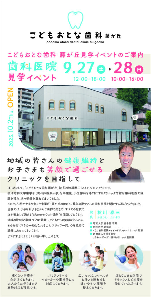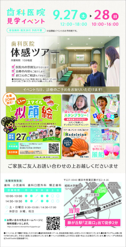 こどもおとな歯科 藤が丘 見学イベントのご案内 2025.09.09 こどもおとな歯科 藤が丘 見学イベントのご案内9月27日(土曜) 12:00~18:009月28日(日曜) 10:00~16:00 歯科医院体験ツアーも実施いたします!・医院内の雰囲気が分かります。・治療の内容をご紹介。・お口元のご相談もできます。 ※イベント当日、診察のご予約をお取りいただけます!【見学イベントは予約不要ですのでお気軽にお立ちよりください!】 開院のお知らせ 前の記事